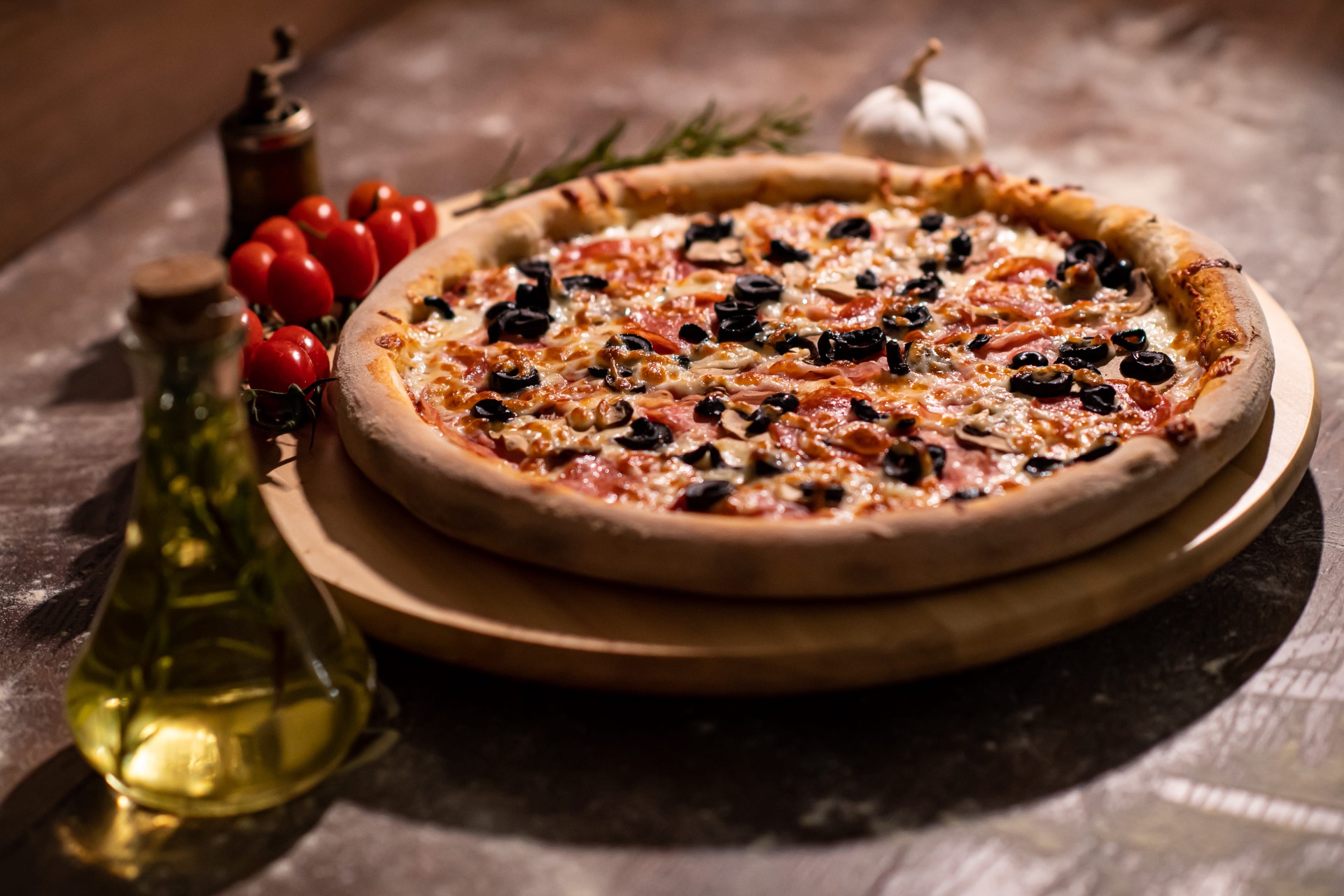 sos rosii, mozzarella , sunca , salam banatean , muschi file , masline , ardei