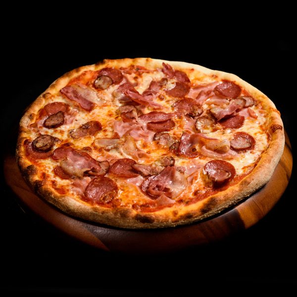 blat classic 290g , sos rosii 50g , mozzarella 150g , bacon 50g , jambon presat 50g, salam secuiesc 50g , carnati 50g , masline 40g , ciuperci 40g , ardei 30g