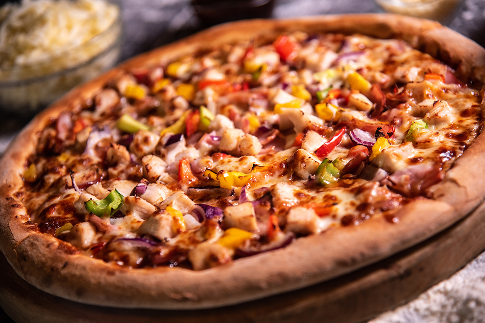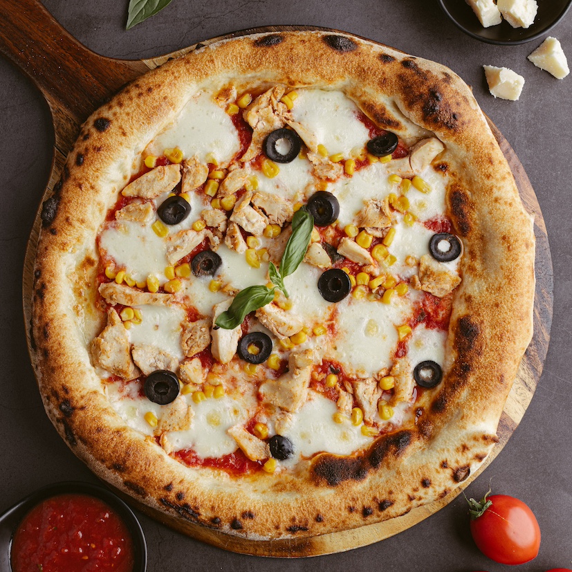 blat classic 290g , sos rosii 50g , mozzarella 150g , piept pui 80g, masline 40g, porumb 40g , oregano 10g