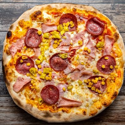 blat classic 290g , sos rosii 50g , mozzarella 150g , bacon 50g ,salam picant 50g ,masline 40g ,rosii 40g , ardei 30g , porumb 40g