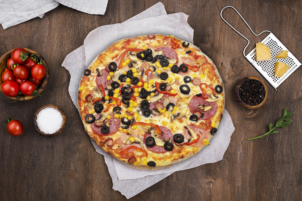 blat classic 290g , sos rosii 50g, mozzarella 150g , ciuperci 40g , masline 40g , ardei 30g , porumb 40g , rosii 30g , ceapa rosie 30g
