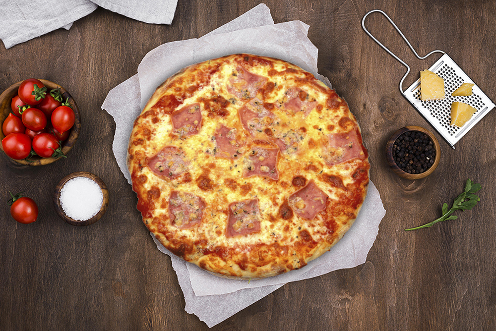 blat classic 290g , sos rosii 50g, mozzarella 150g, jambon presat 70g , ciuperci 40g , masline 40g