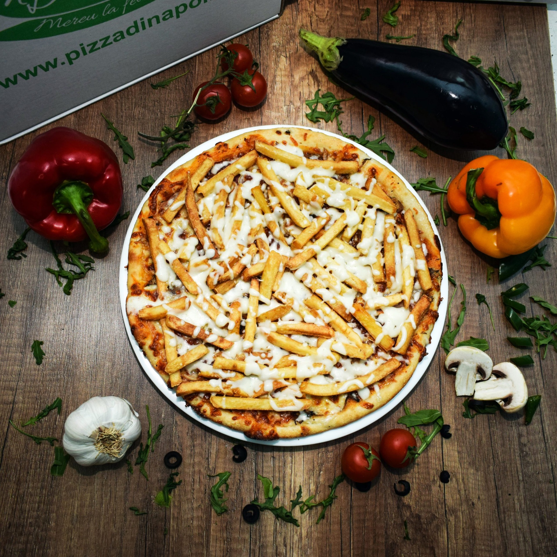 blat classic 290g , sos rosii 50g , mozzarella 150g , cartofi prajiti condimentati 150 g , bacon crispy 50 g , sos usturoi 50 g